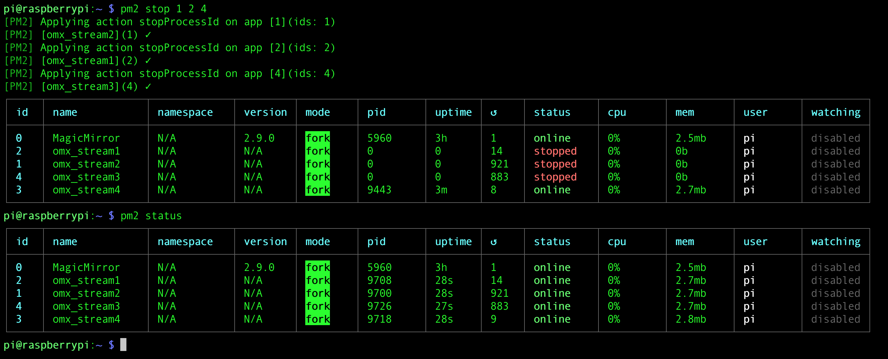 import os if "stopped" in os.popen("pm2 status | grep \"stopped\"").read(): os.popen("pm2 start 1 2 3 4")I saved it as streamMonitor.py in my home directory. I run it once per minute using crontab. This is the entry I put in: