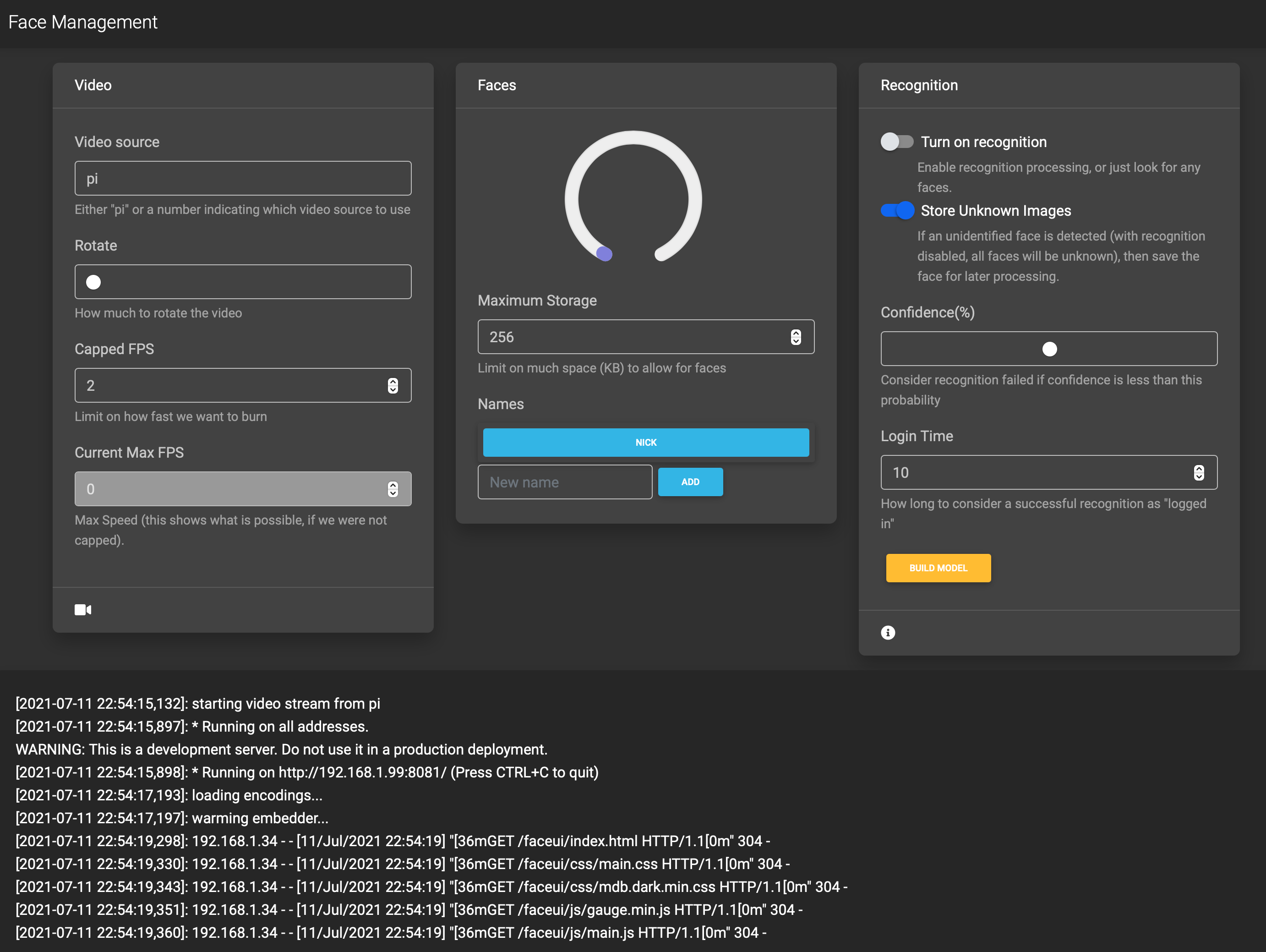 The above image shows the admin interface that allows you to update the recognition parameters, rebuild the model, without having to restart your mirror in any way. Lots more documentation is all contained within the README of the actual project.