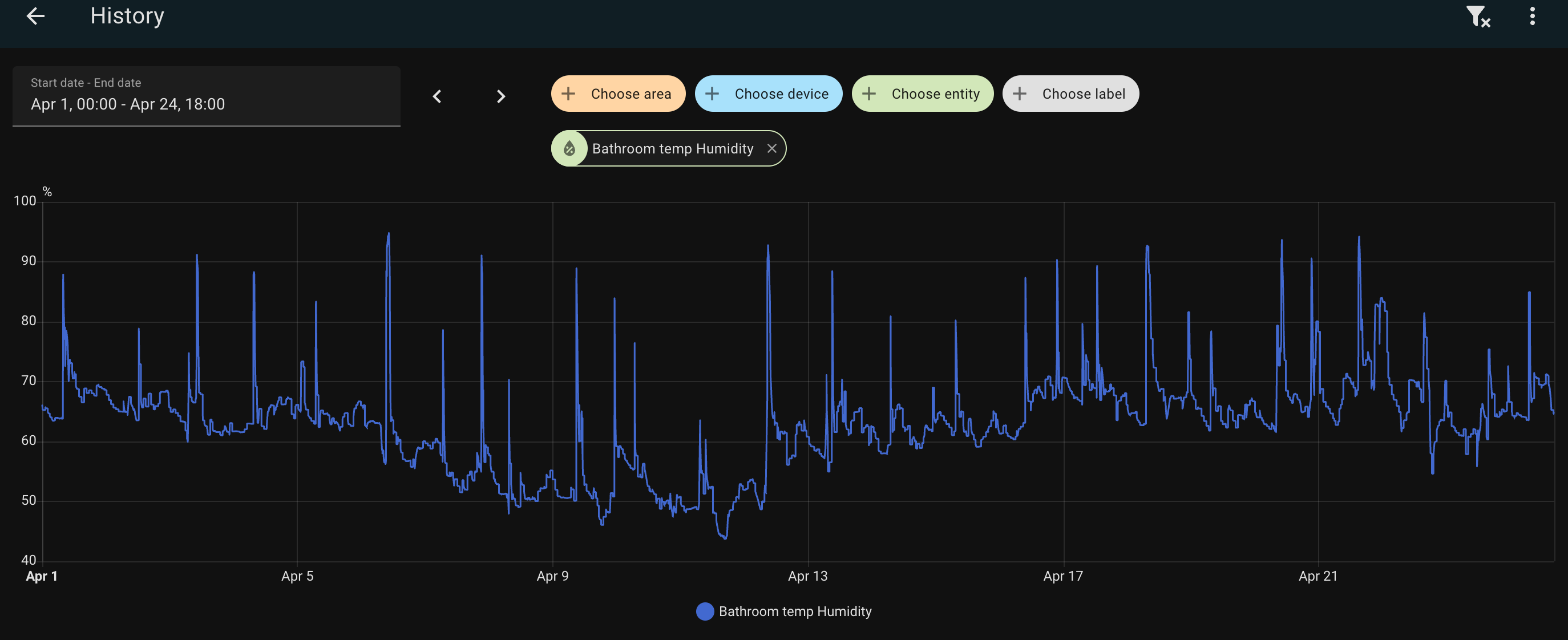 Here is the graph of the humidity in my bathroom for the past month: