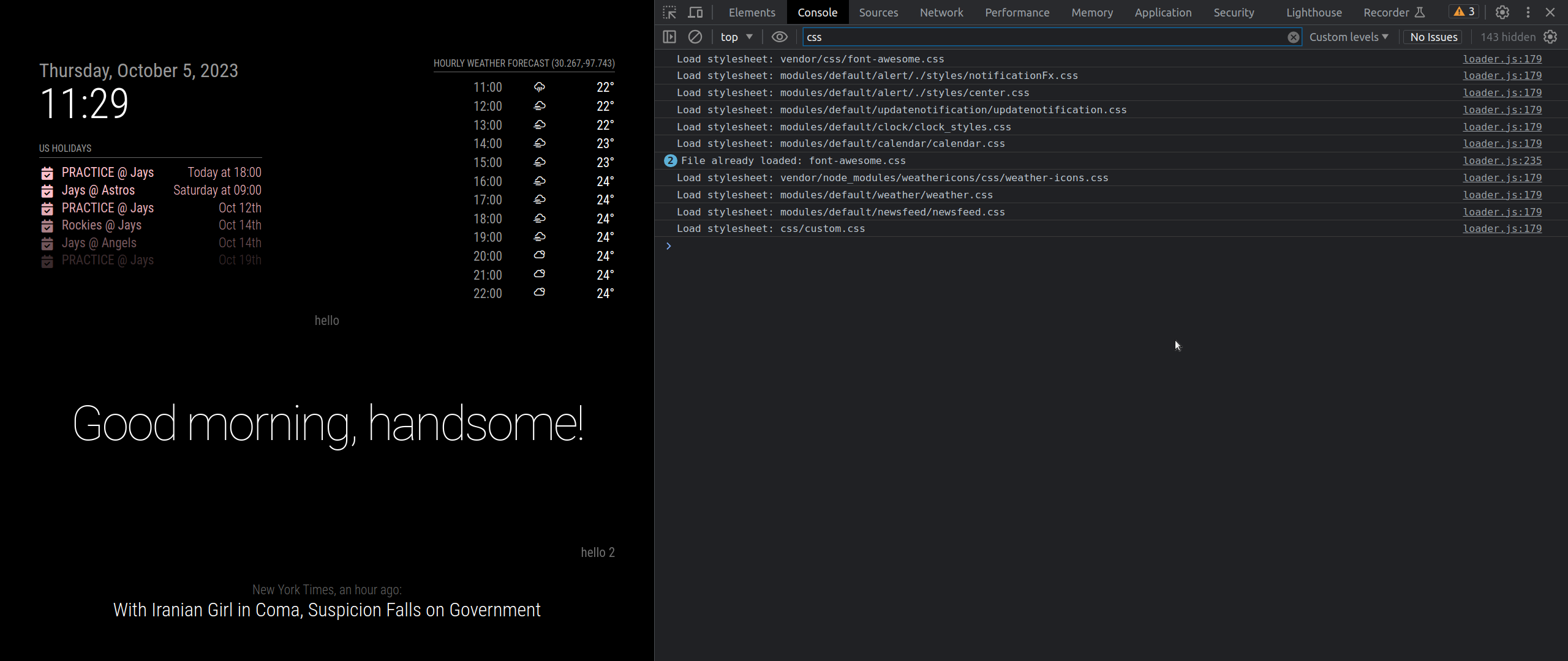 I seem to be having an issue with my installation of MM. I’ve tried adding a custom.css file to change the fonts and colors on some of the modules I’m using, and despite my efforts, it constantly acts as though the custom.css file either isn’t there or is being overridden by something.