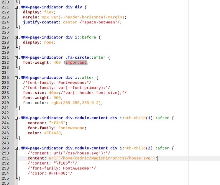 @com1cedric MMM-page-indicator was updated recently so you do not have to use the nth-child stuff anymore. Checkout the latest version and the readme. I have added some samples of how you can use it. You should reference the svg as either @sdetweil or @karsten13 has shown and it should work.