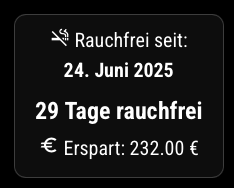 It shows how many days you’ve been smoke-free, how much money you’ve saved, and your next milestone — all wrapped in a motivational display.