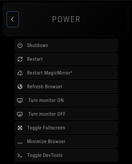 MMM-Remote-Control lets you control your MagicMirror² from any device on your network – your phone, tablet, or computer. So you can control your mirror from your couch using your cell phone, for example.