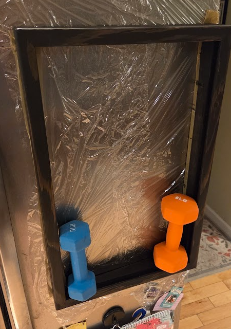 After countersinking and wet-setting the 16 N42 5/8" magnets, I attached the chassis to the refrigerator door with some seran wrap - this allowed the magnets to align with the door for the best contact surface, and I let it cure overnight. Testing with a few dumbells made me more confident that I’d used enough magnets!!
