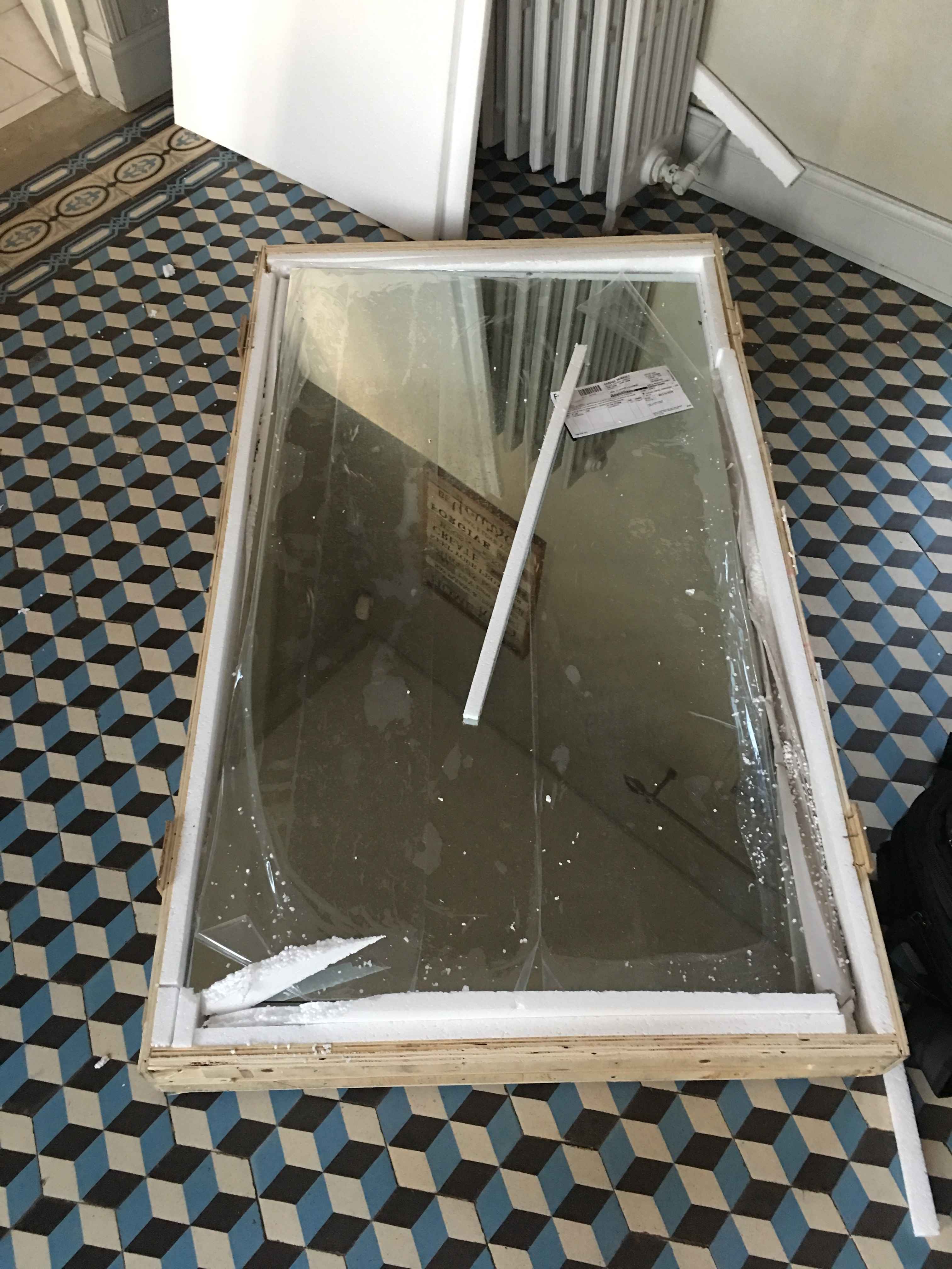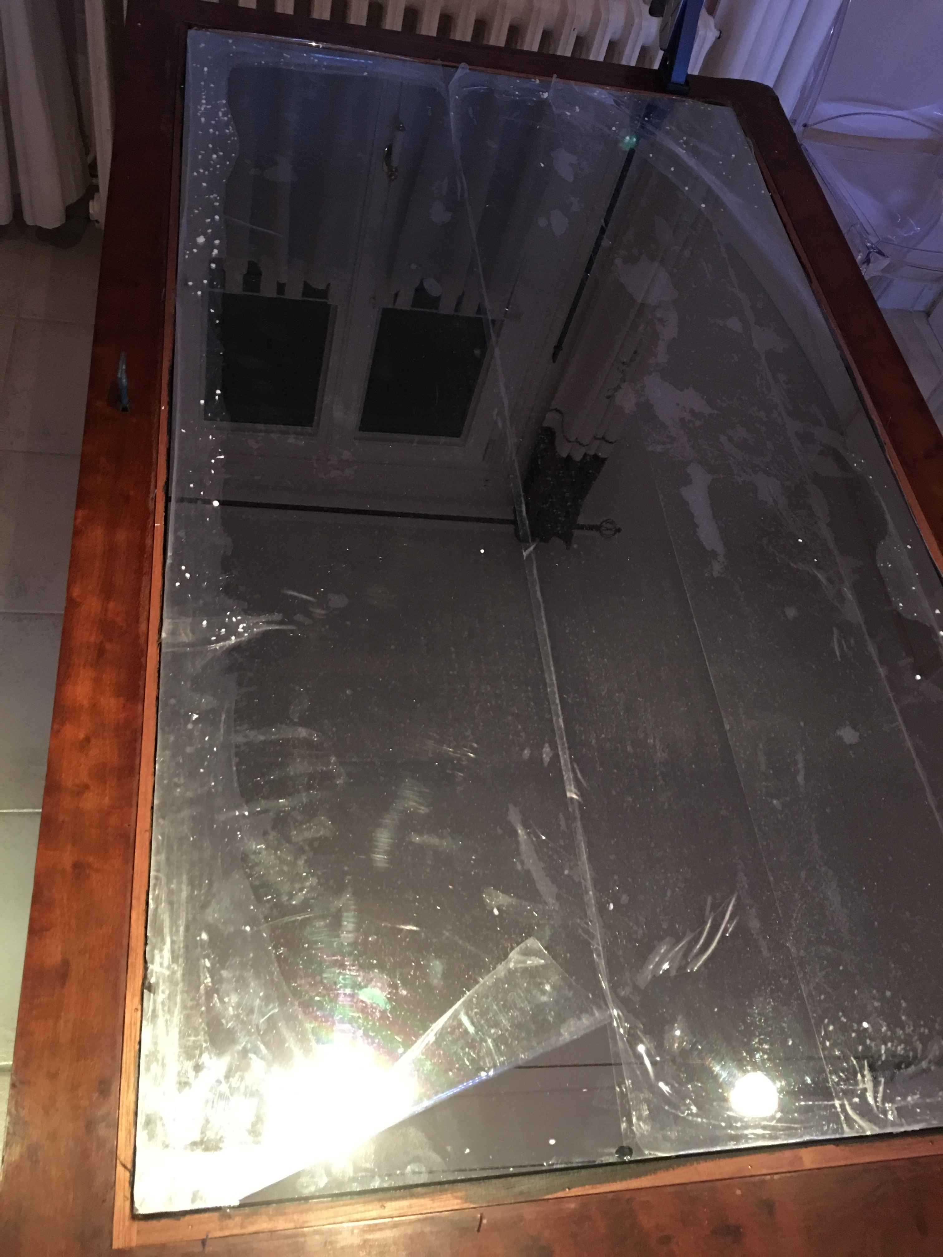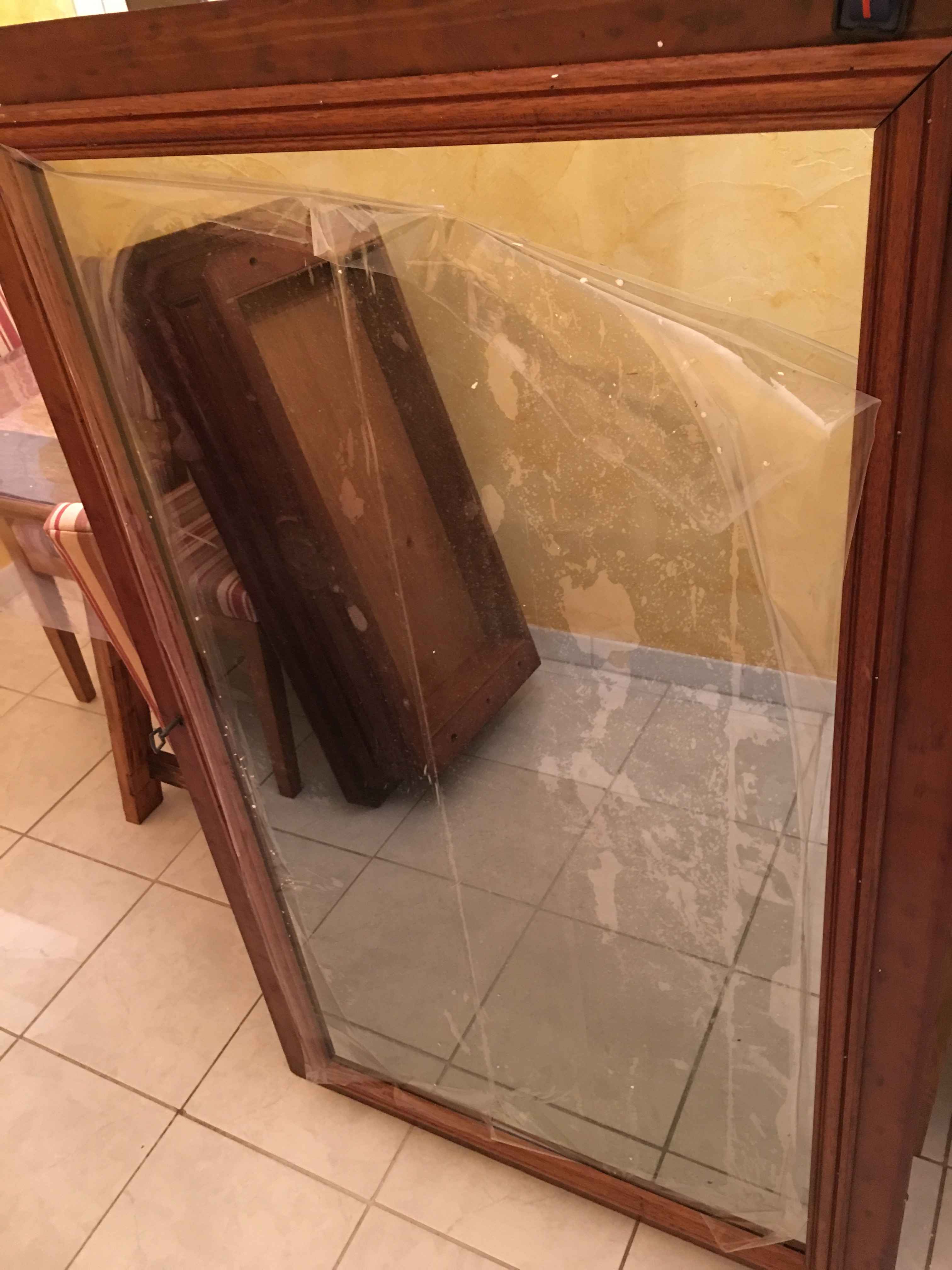 I just finished my second mirror. I recovered an old piece of furniture that was broken. I took it all away and repaired it. As you can see: there is a white mark on the right side. I dropped during the installation.