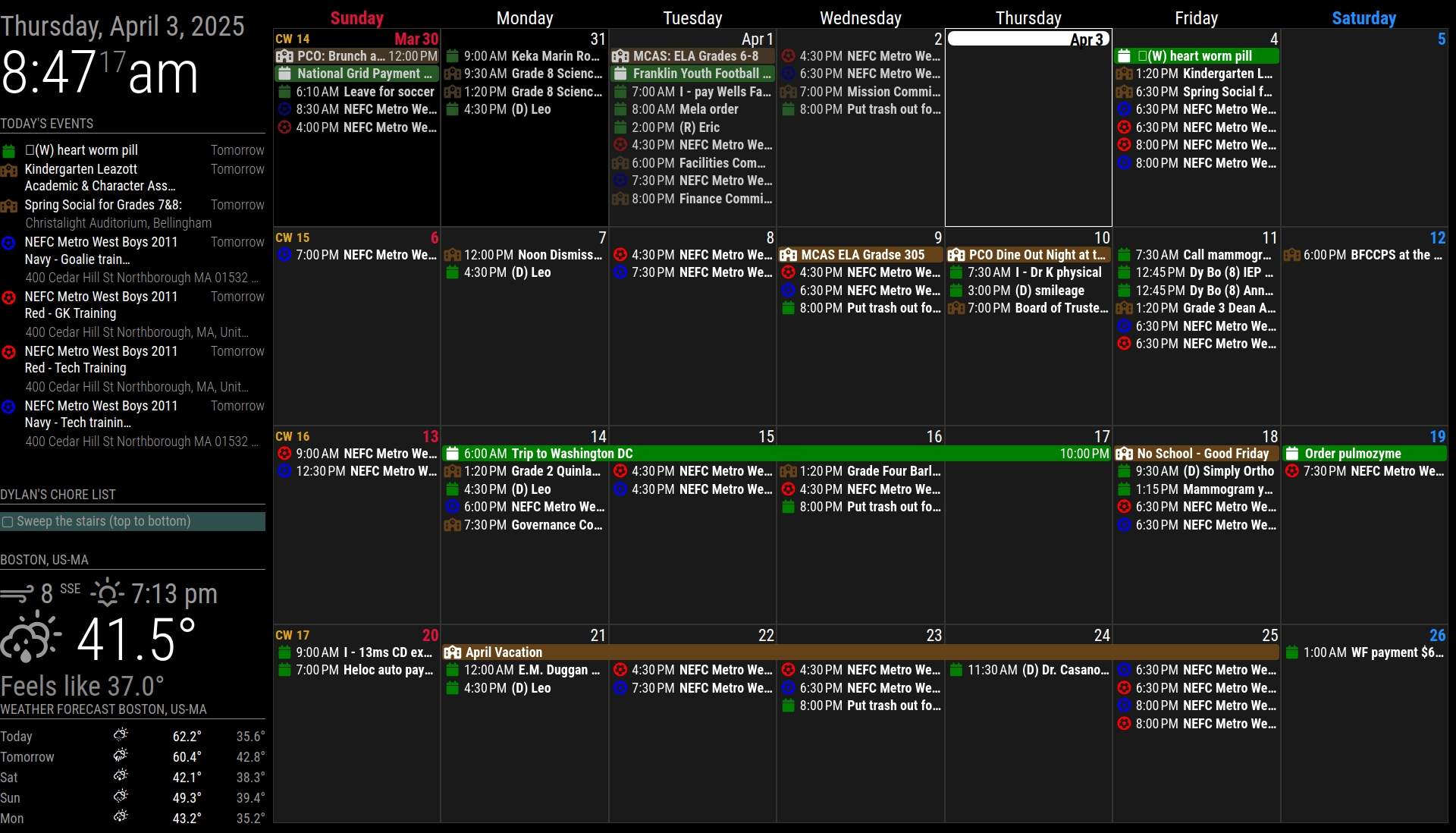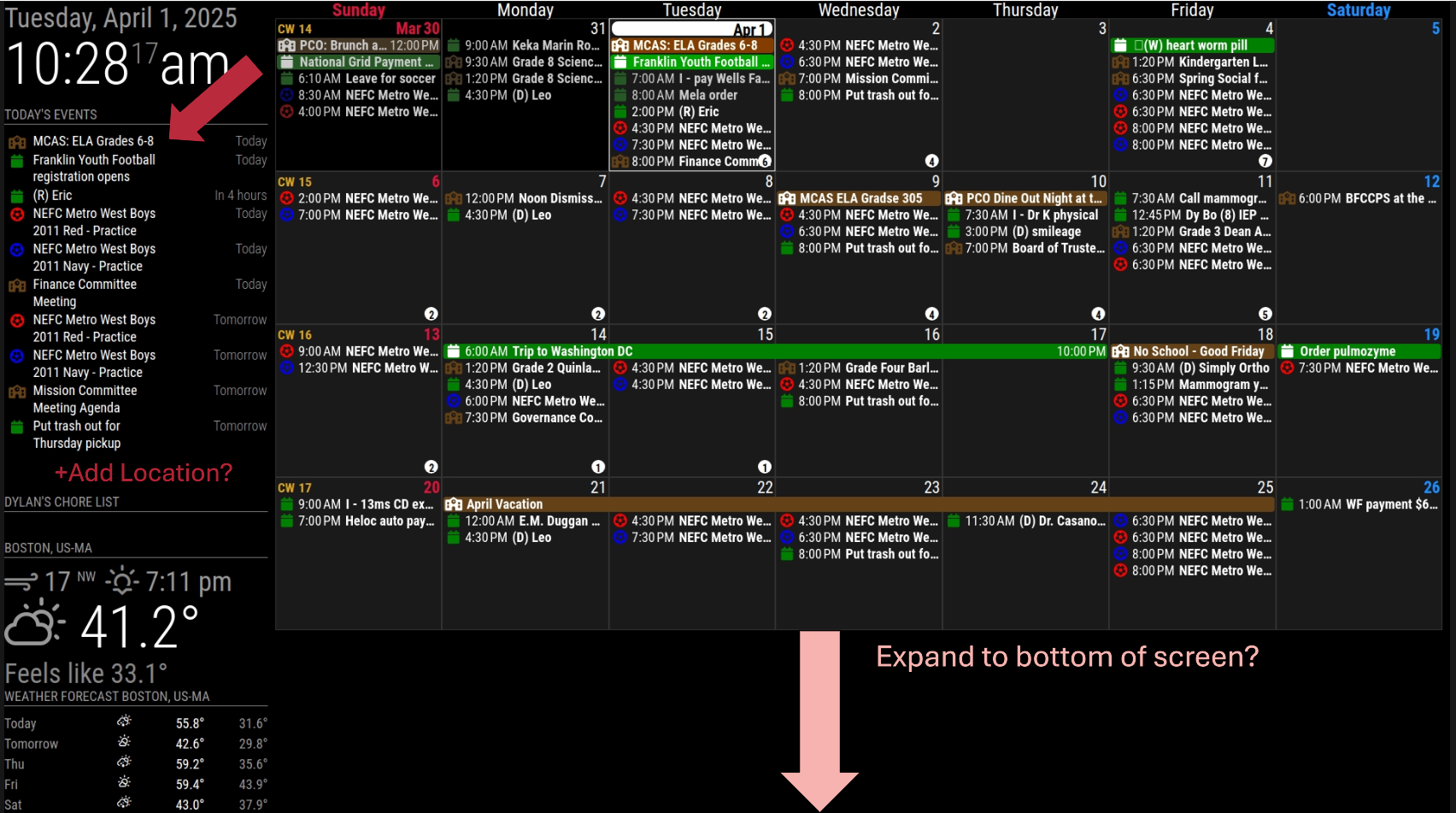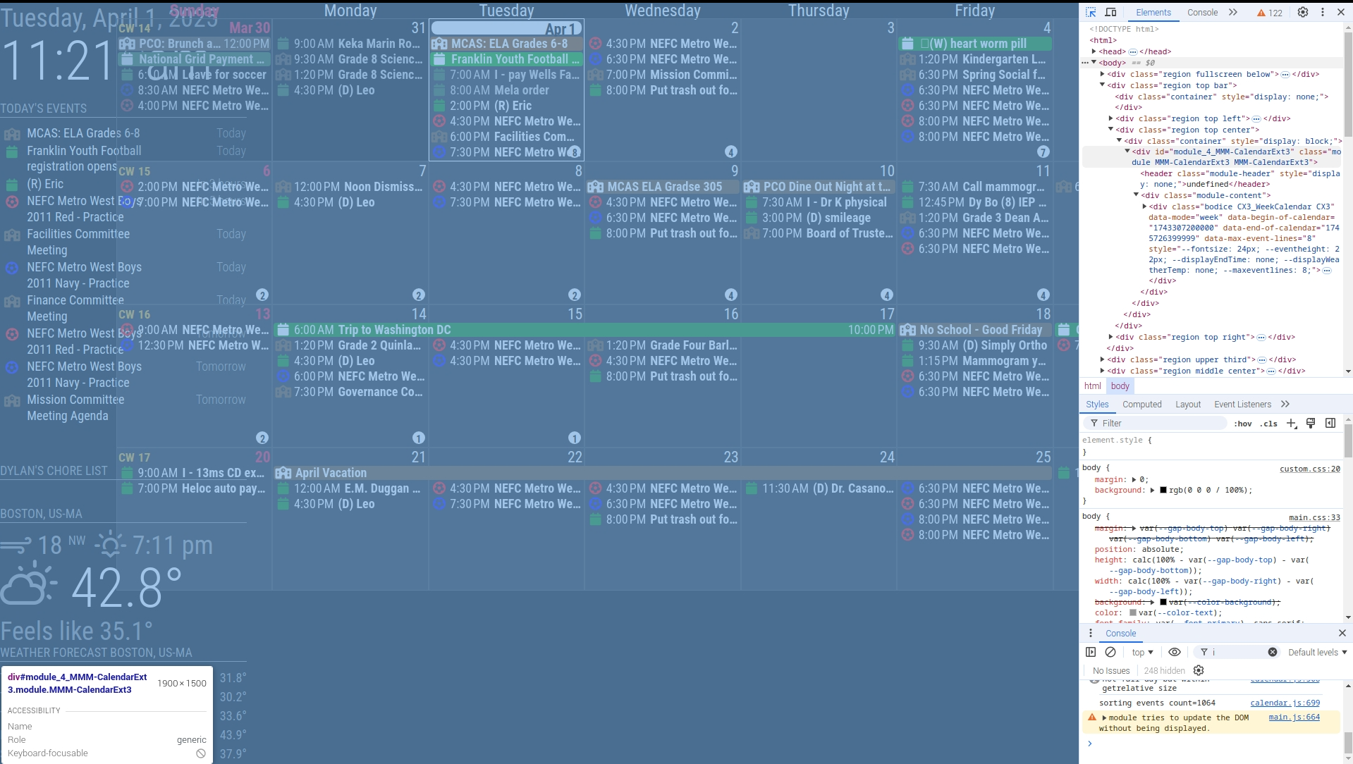 Hello, I started out this journey dabbling around and getting in WAY over my head. (I’m still in way over my head, but no longer scared to be here. I had originally setup my mirrorless Family board by resizing regions and while trying to fine tune my board I was running into all kinds of issues. SO I wiped MM from my pi and started over. I’m looking for advice on my current setup (advice on things I did wrong and how I could do better) Also wondering in the agenda side of things, can I somehow make the event line longer on top to have less wrap around…can I also somehow show the location of the event if there is one? Last but not least, I can’t seem to extend the MMM-CalendarEXT3 module to the bottom of the screen, is there some sort of limit to the size of it that I haven’t come across yet? While in Dev model, when I try to select the agenda module, I can only select the EXT3 module because of the Olympics sizes movements I went through to move the module in the spot it is in currently. Should I have done that differently?